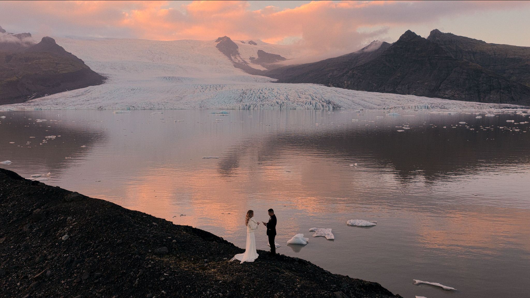 For Jenny and David’s ceremony, we positioned ourselves away from the main viewpoints where tour buses cycle through visitors. We found a quiet stretch of black sand with a clear view of the glacier’s face and the lagoon spreading out before it. The light was fading fast.